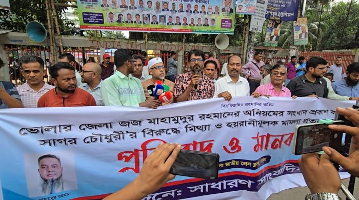 জেলা জজের দুর্নীতি আড়াল করতে সাংবাদিকের বিরুদ্ধে মিথ্যা মামলার প্রতিবাদে মানববন্ধন